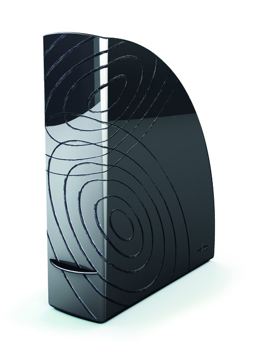 pojemnik na czasopisma, wykonany z odpornego na pęknięcia i odkształcenia polistyrenu w 100% recyklowanego szerokość grzbietu: 80mm pojemność: ok. 750 kartek o gramaturze 80gsm i maksymalnym rozmiarze 24x32cm na grzbiecie uchwyt ułatwiający zdejmowanie z półki niski próg do łatwego wyjmowanie materiałów oryginalny design wzorowany na motywach z przyrody wymiary: 82x310x259mm kolor czarny