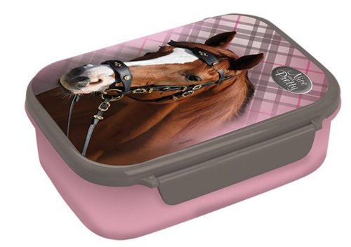 Pojemnik na śniadanie. Wykonany z plastiku - dolna część jednokolorowa, górna - wieczko z wielokolorowym nadrukiem. Zamknięcie plastikowe/zatrzaskowe podwójne na dłuższych bokach. Nie jest dostosowany do podgrzewania w mikrofalówce, ani do mycia w zmywarce. Szerokość: 17,5 cm