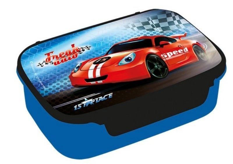 Pojemnik na śniadanie. Wykonany z plastiku - dolna część jednokolorowa, górna - wieczko z wielokolorowym nadrukiem. Zamknięcie plastikowe/zatrzaskowe podwójne na dłuższych bokach. Nie jest dostosowany do podgrzewania w mikrofalówce, ani do mycia w zmywarce. Szerokość: 17,5 cm