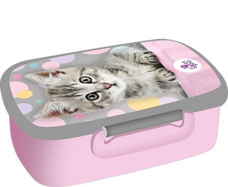 Pojemnik na śniadanie. Wykonany z plastiku - dolna część jednokolorowa, górna - wieczko z wielokolorowym nadrukiem. Zamknięcie plastikowe/zatrzaskowe podwójne na dłuższych bokach. Nie jest dostosowany do podgrzewania w mikrofalówce, ani do mycia w zmywarce. Szerokość: 17,5 cm