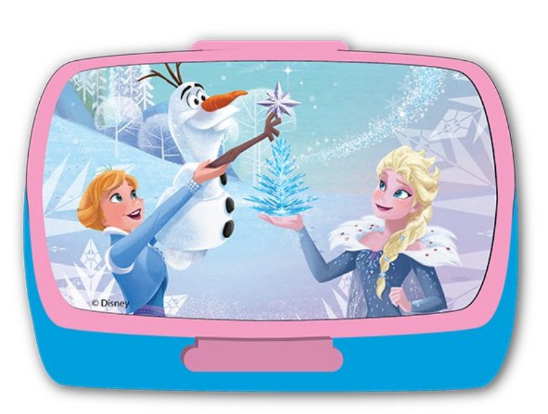 Pojemnik na śniadanie. Wykonany z plastiku - dolna część jednokolorowa, górna - wieczko z wielokolorowym nadrukiem. Zamknięcie plastikowe/zatrzaskowe podwójne na dłuższych bokach. Może służyć również do przechowywania drobiazgów. Nie jest dostosowane do podgrzewania w mikrofalówce, ani do mycia w zmywarce. Wymiary:17,5x13x6,5cm