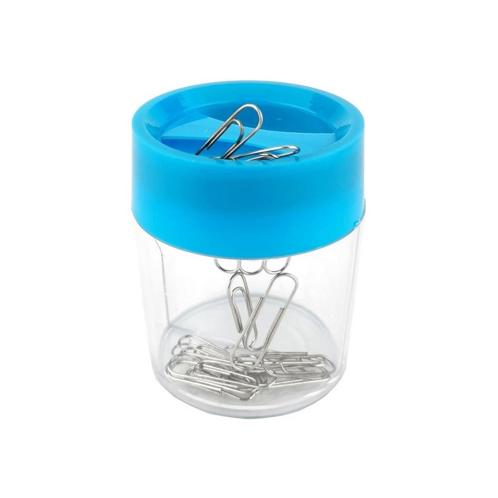 Pojemnik na spinacze okrągły. Wyposażony w magnetyczną pokrywką ułatwiającą wyjmowanie spinaczy. Poręczny i wygodny w użyciu, niezbędny w każdej pracy biurowej.