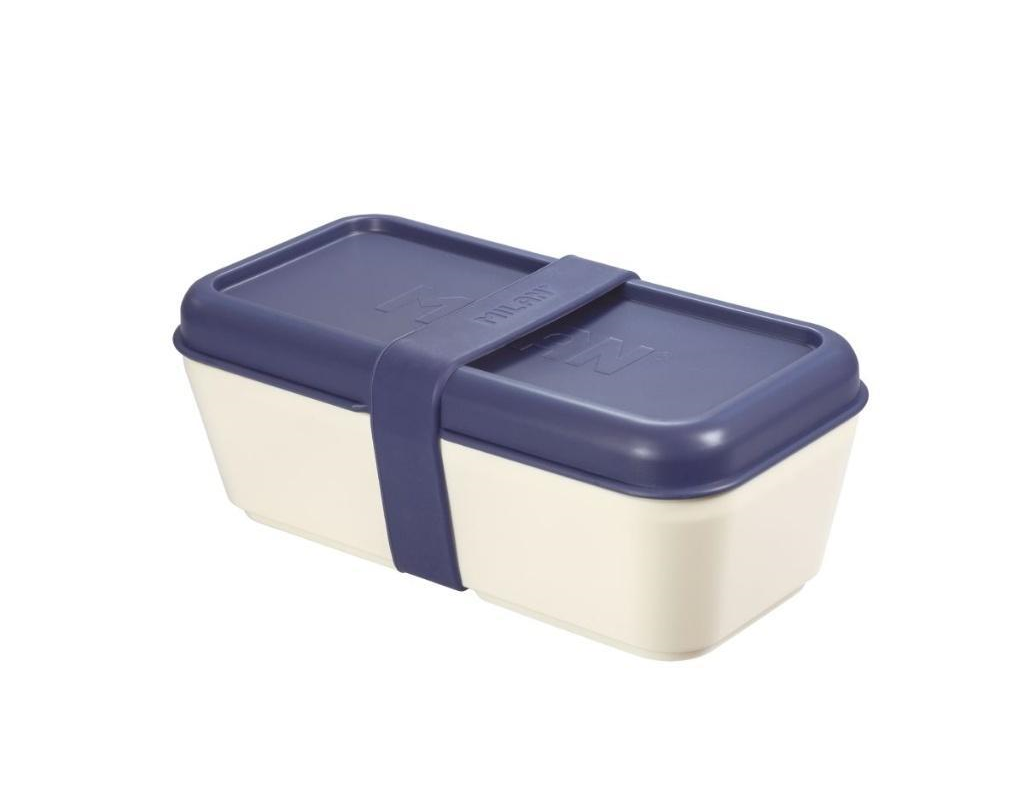Prostokątny biały pojemnik na lunch z niebieską pokrywką. Posiada wewnętrzną przegrodę, która umożliwia rozdzielenie dwóch rodzajów żywności w tym samym pojemniku oraz granatowy zewnętrzny elastyczny pasek silikonowy. Nadaje się do odgrzewania w kuchence mikrofalowej (maks. 70oC) z otwartą pokrywą dla uwolnienia pary. Nadaje się także do przechowywania w zamrażarce (do -20oC) i do mycia w zmywarce do naczyń (maks. 70oC). Pokrywy i pojemniki można łatwo łączyć ze sobą. Matowe zewnętrzne wykończenie ułatwia uchwyt. Wnętrze z zaokrąglonymi narożnikami i błyszczącym wykończeniem dla lepszego czyszczenia. Materiał: tworzywo sztuczne wolne od BPA. Rozmiar: 20 x 10 x 7,5 cm. Pojemność: 0,75 litra.
