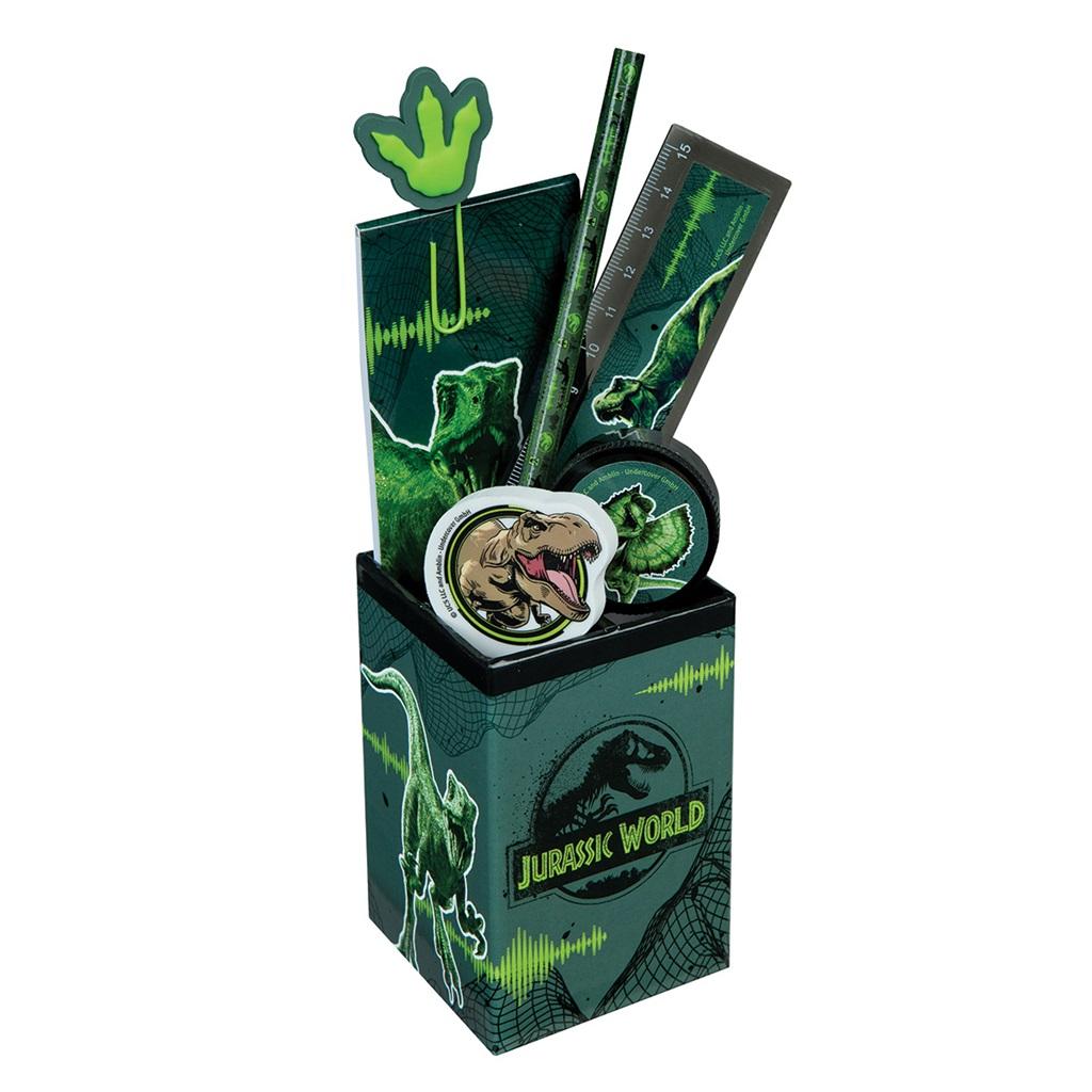Pojemnik z Przyborami Szkolnymi, 7 el. Jurassic World Pojemnik z przyborami szkolnymi, stanowiącymi podstawowe wyposażenie każdego malucha. Starannie wykonany, złożony z pojemnika, notatnika, spinacza, ołówka, temperówki, gumki i linijki. Wszystkie akcesoria zdobione są motywem z filmu Jurassic World. One też mogą towarzyszyć dzieciom w codziennych szkolnych zmaganiach. Dzięki nim szkoła może być fajna. Nieważne czy jesteś pierwszoklasistą czy piątoklasistą - potrzebujesz przyborów do szkolnej przygody. Piękny pojemnik, idealny jako podstawowe wyposażenie biurka. Dzięki niemu łatwo utrzymasz porządek. Podzielony na 3 oddzielne części, na każdej ściance widoczna jest inna grafika z filmu Jurassic World. Zestaw zawiera 7 elementów: pojemnik, ołówek, gumkę, linijkę, temperówkę, notatnik i spinacz do papieru. Wymiary pojemnika: 10 cm x 6,5 cm x 6,5 cm. Wymiary opakowania: 6,5 cm x 19 cm x 13,5 cm. Kategoria wiekowa: 3+. Uwaga: W skład zestawu wchodzą elementy z ostrymi końcówkami. Istnieje ryzyko zadrapania lub skaleczenia.