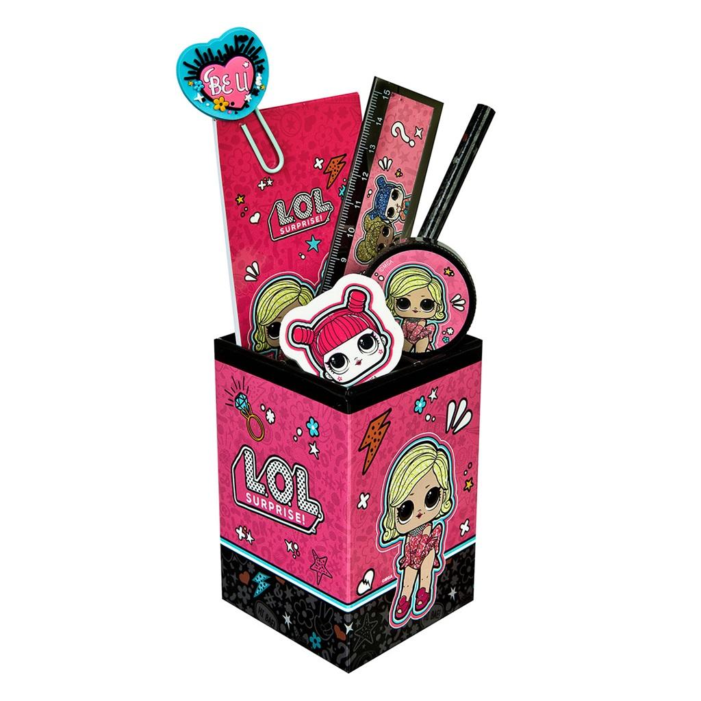 Pojemnik z Przyborami Szkolnymi, 7 El., LOL Surprise Pojemnik z przyborami szkolnymi, stanowiącymi podstawowe wyposażenie każdego malucha. Starannie wykonany, złożony z pojemnika, notatnika, spinacza, ołówka, temperówki, gumki i linijki. Wszystkie akcesoria zdobione są wizerunkami LOL Surprise. One też mogą towarzyszyć dzieciom w codziennych szkolnych zmaganiach. Dzięki nim szkoła może być fajna. Nieważne czy jesteś pierwszoklasistą czy piątoklasistą - potrzebujesz przyborów do szkolnej przygody. Piękny pojemnik, idealny jako podstawowe wyposażenie biurka. Dzięki niemu łatwo utrzymasz porządek. Podzielony na 3 oddzielne części, na każdej ściance widoczna jest inna grafika LOL Surprise. Zestaw zawiera 7 elementów: pojemnik, ołówek, gumkę, linijkę, temperówkę, notatnik i spinacz do papieru. Wymiary pojemnika: 10 cm x 6,5 cm x 6,5 cm. Wymiary opakowania: 7 cm x 24 cm x 9 cm.