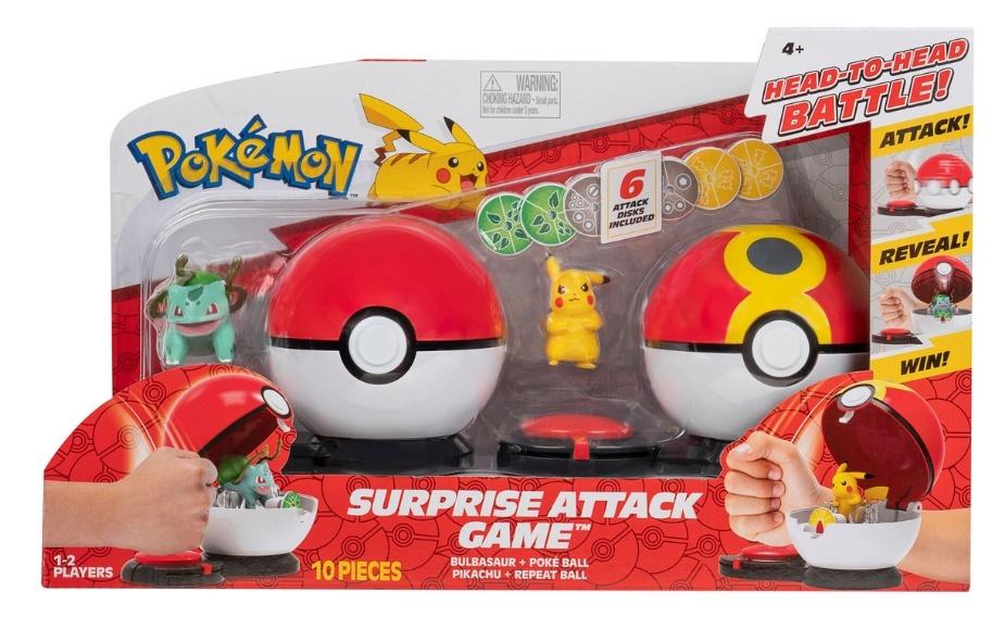 Gra ,,Surprise Attack"" z serii Pokémony ma proste zasady i jest bardzo wciągająca! Wystarczy, że wybierzesz Pokémona, z którym chcesz walczyć i dysk atakujący, włożysz je do Pokéballa Surprise Attack i wciśniesz przycisk, aby wprawić Pokéballa w ruch obrotowy i odsłonić swojego Pokémon oraz jego atak! Możesz zagrać zgodnie z zasadami treningu dla 1 gracza lub rzucić wyzwanie przyjaciołom i zagrać z nimi w grę dla Młodszych Trenerów Pokémonów lub od razu przejść na następny poziom i zagrać w grę dla Starszych Trenerów Pokémonów!