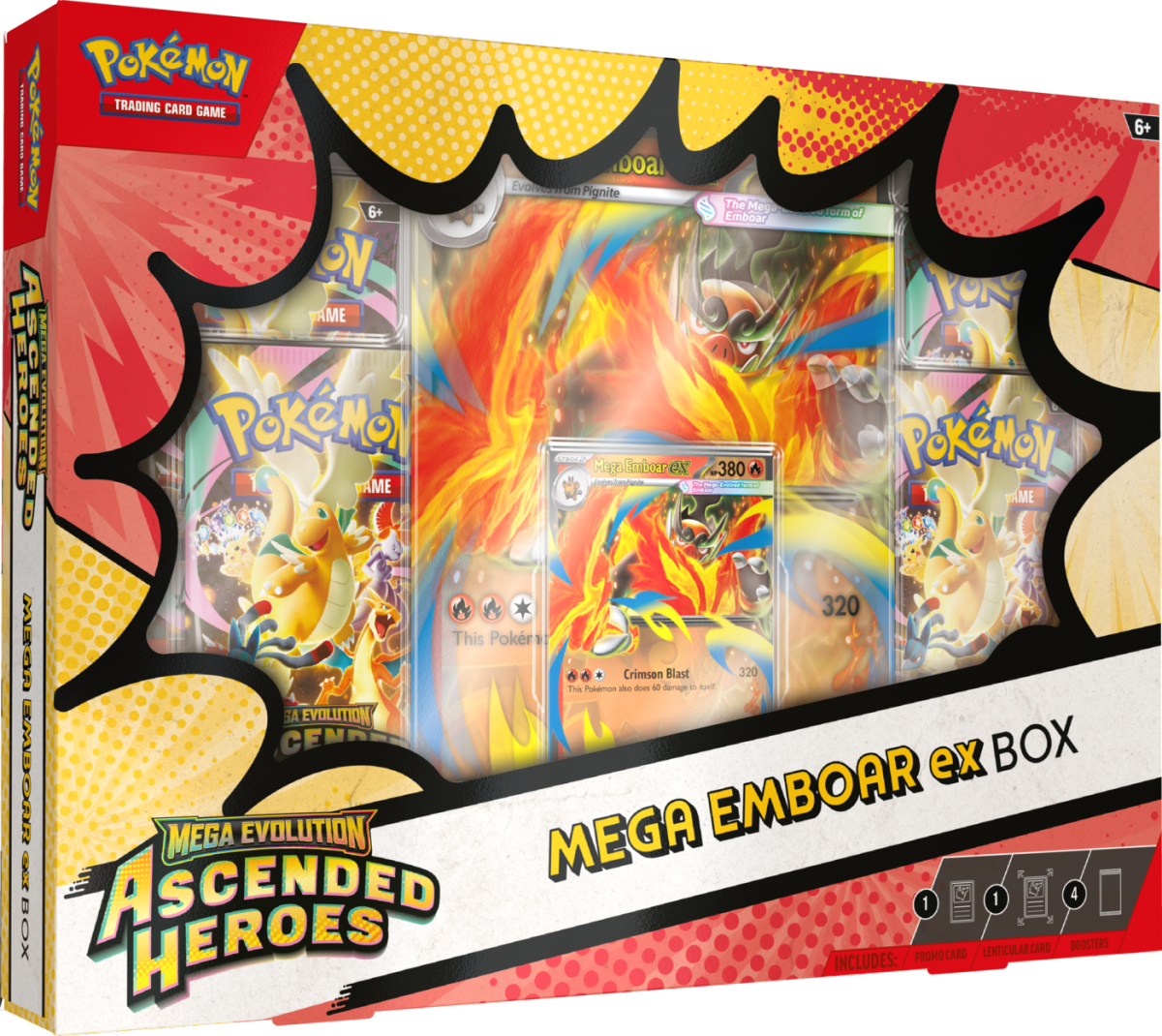 W zestawie Pokémon TCG: Mega Evolution - Ascended Heroes - Mega Emboar ex Box znajdziesz Mega Emboar ex jako grywalną kartę promo foil, a także powiększoną kartę lentikularną z dynamiczną grafiką oraz cztery boostery ze specjalnego dodatku Mega Evolution - Ascended Heroes.