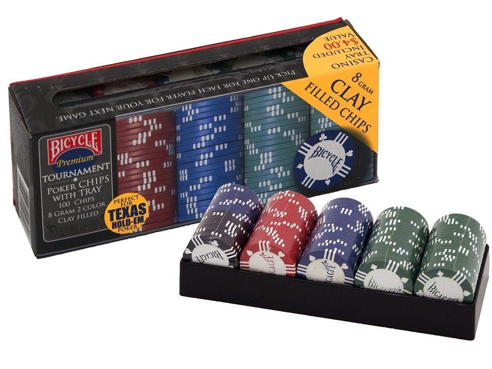 Zestaw 100 żetonów do pokera Amerykańskiej marki Bicycle. Waga pojedynczego żetonu - 8 g Żetony ułożone na czarnej, plastikowej tacy. Całość zapakowana w efektowny karton. Konfiguracja poszczególnych kolorów: 40 x zielone 30 x niebieskie 20 x czerwone 10 x czarne Idealna alternatywa dla domowych rozgrywek jak i profesjonalnych turniejów.
