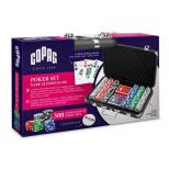 Czarna metalowa walizka, 300 żetonów US z hologramem i nominałami (50 zielonych żetonów pokerowych / 50 czarnych żetonów pokerowych / 50 niebieskich żetonów pokerowych / 100 szarych żetonów pokerowych / 50 czerwonych żetonów pokerowych?). Dwie talie kart COPAG(R) Jumbo Face - 4 PK, 1 akrylowy żeton dealera 65x12mm, 5 kostek i 1 wielojęzyczna instrukcja z zasadami gry.