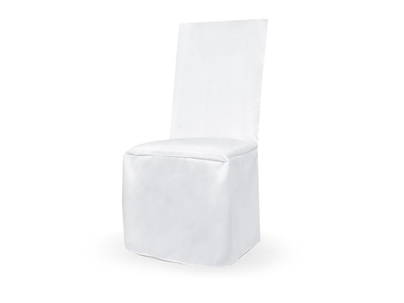 Pokrowiec z matowej tkaniny w kolorze białym, uniwersalny, bez zakładek. Podane na rysunku wymiary to dł. maksymalne, pokrowce ładnie układają się również na krzesłach mniejszych.