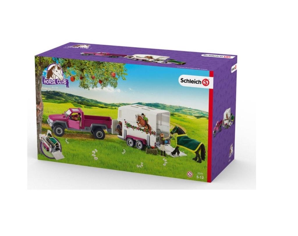 Zestaw figurek: półciężarówka z przyczepką oraz koń i jeździec. Seria Horse Club zawiera figurki koni uwielbianych na całym świecie oraz akcesoria niezbędne do opieki nad nimi. Tu znajdziecie wszystko, czego potrzebuje koń, by był zdrowy, zadbany i pięknie prezentował się na wybiegu. W serii Horse Club znajdziesz wiele zestawów, które pozwolą zbudować własny, wymarzony świat. Odnajdziesz tam stajnię, piękny pokaz jeździecki, wybieg, padok, myjnię, ciężarówkę z przyczepą, wóz z zaprzęgiem oraz mnóstwo oprzyrządowania jeździeckiego i akcesoriów do opieki nad końmi, różnorodne figurki jeźdźców, ale przede wszystkim swoje ulubione rasy koni, z których będziesz mógł stworzyć całą hodowlę. Przyczepa jest otwierana, posiada bagażnik do przewożenia oprzyrządowania jeździeckiego, przegrodę na środku i może mieścić dwa pełnowymiarowe konie.