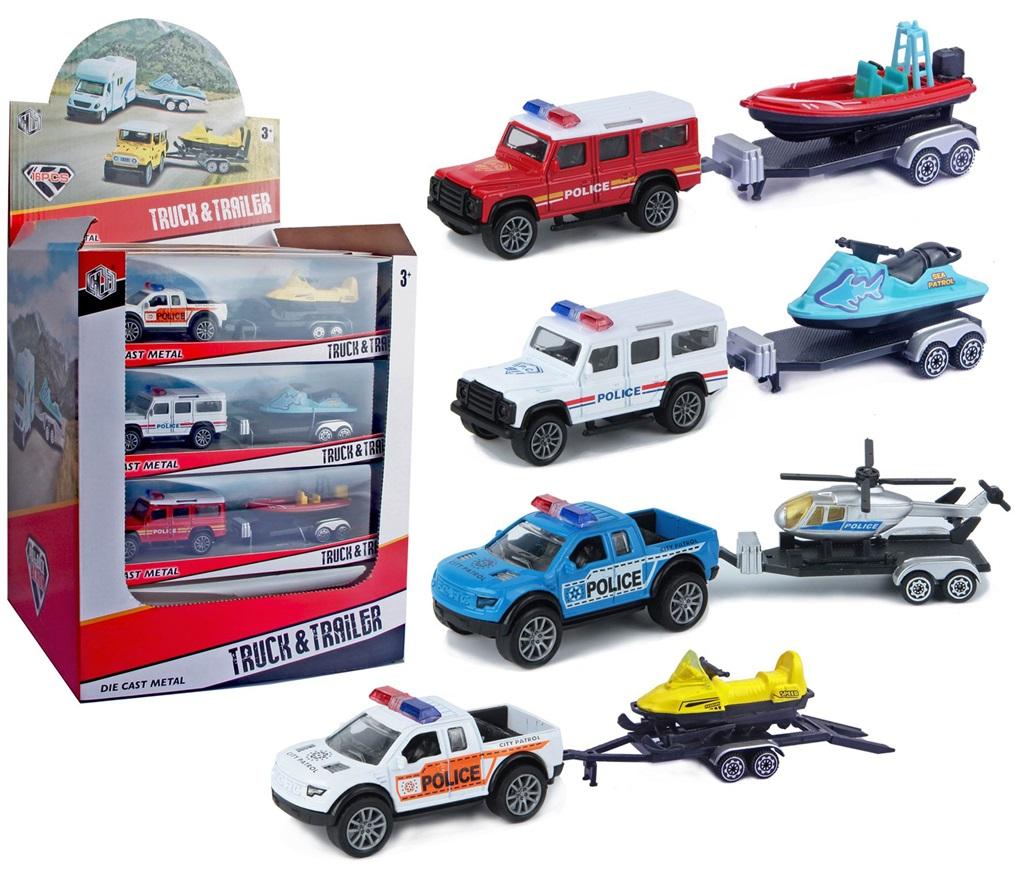 Metalowe terenowe auto policyjne z lawetą z różnymi pojazdami.