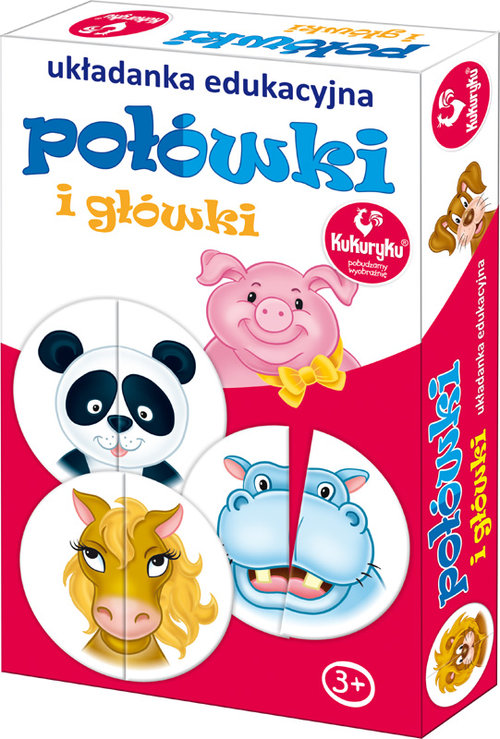 „Połówki i główki” to wesoła układanka dla dzieci. Dzieciom rozdaje się po 3 lewe części zwierzaczków, a prawe układa się na stole obrazkiem w dół. Dzieci losują je po kolei. Gracz, który pierwszy ułoży swój zestaw, wygrywa. Kartoniki można wykorzystać także do gry typu memory oraz jako klasyczną układankę puzzlową dla jednego dziecka. Zestaw zawiera 30 twardych kartoników, z których można ułożyć 15 kompletów.