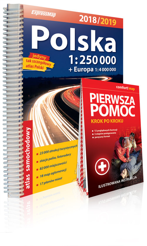 Opakowanie Polska 1:250 000 atlas samochodowy + instrukcja pierwszej pomocy 2018/2019