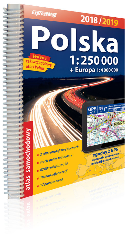 Z atlasem samochodowym Polski wydawnictwa ExpressMap podróż po kraju będzie prawdziwą przyjemnością. To jedyna tak szczegółowa tego typu publikacja na rynku. Uwzględnia 82 tys. miejscowości i 365 tys. km dróg. Publikacja jest użyteczna zarówno dla zawodowych kierowców, jak i turystów podróżujących samochodem – zaznaczono w niej także atrakcje turystyczne. Atlas zawiera: • aktualny stan sieci drogowej, a także drogi w budowie i planowane do 2020 r., • autostrady i drogi ekspresowe z nazwami węzłów, • krajową i międzynarodową numerację dróg, • odległości drogowe, • stacje paliw z podziałem na sieci, • fotoradary stałe, odcinkowe pomiary prędkości, • wybrane motele i hotele, • granice parków narodowych i krajobrazowych, • miejscowości atrakcyjne turystycznie, • plastyczną rzeźbę terenu, • skorowidz ponad 71 tys. miejscowości z terenu Polski wraz z informacją o województwie i powiecie, • 18 tranzytowych map miast, • 17 planów miast, • atlas Europy 1:4 000 000, • mapę dróg objętych systemem viaTOLL i płatnych autostrad. • formularz wspólnego oświadczenia o zdarzeniu drogowym.