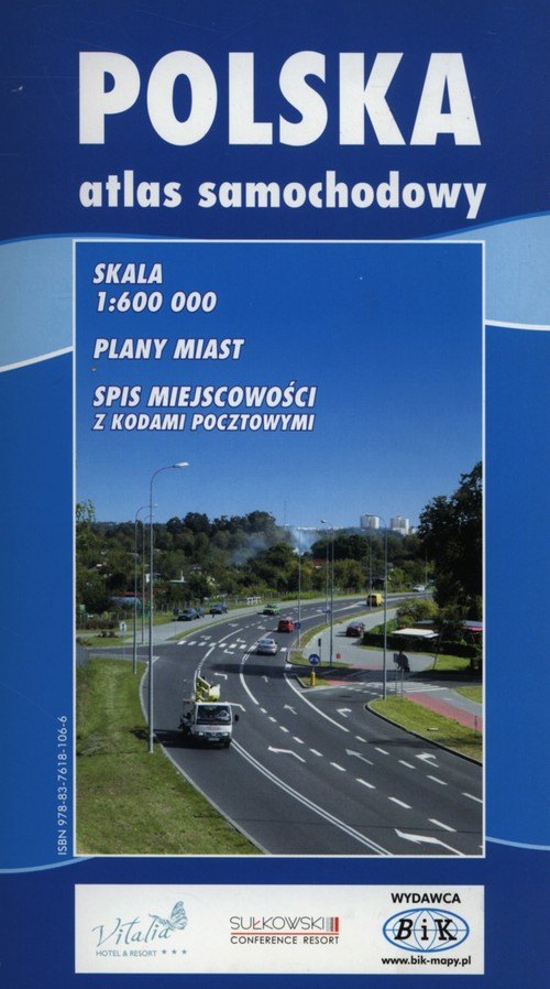 Dokładne mapy Polski w skali 1:600 000, 18 planów większych miejscowości ,spis miejscowości z kodami pocztowymi. Atlas składa się z 3 części: - mapy samochodowej Polski w 10 rozkładanych arkuszach uzupełnionej tabelą odległości. Aktualna numeracja dróg, ; - 18 planów większych miast; - spis miejscowości wraz z kodami pocztowymi.