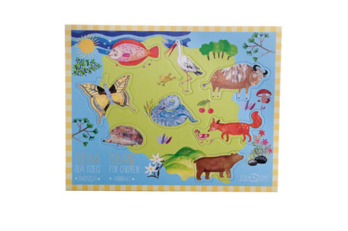 Polska dla dzieci: Zwierzęta to układanka dla najmłodszych. Na grubej tekturze obciągniętej płótnem umieściliśmy ilustrację Polski wraz z ośmioma charakterystycznymi dla naszego kraju zwierzętami.