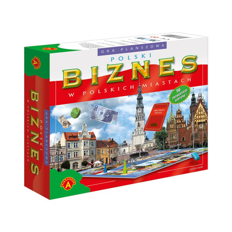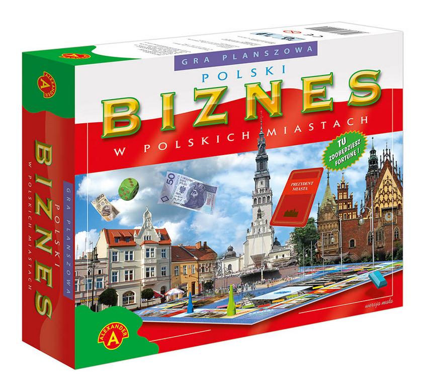 "Polski biznes w polskich miastach" to gra planszowa, która przenosi graczy w świat biznesu w polskich miastach - dużych i małych. W tym świecie każdy przeżyje wiele emocji związanych z prowadzeniem finansowych operacji podejmowaniem ryzykownych decyzji, zdobywaniem kapitału na rozwój inwestycji, który jest niezbędny, by wygrać walkę z konkurencją. Dodatkowym elementem gry jest katalog miast, w którym gracze mogą się zapoznać z podstawowymi informacjami o 10 największych polskich miastach. Zawartość: - plansza - 4 pionków - 52 elementów inwestycji - 55 kart - 100 banknotów - czeki - kostka - instrukcja