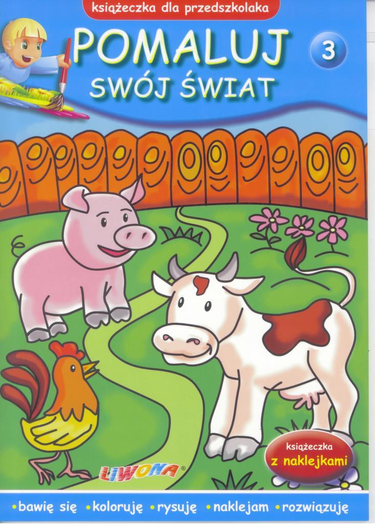 Pomaluj swój świat to seria edukacyjnych książeczek z naklejkami dla przedszkolaków. Książeczki wspomagają rozwój dziecka, a bogato ilustrowane propozycje łamigłówek przyciągają wzrok i zachęcają do ich rozwiązywania. Zestawy ćwiczeń mobilizują dziecko do koncentracji, trenują spostrzegawczość i logiczne myślenie oraz doskonalą zdolności plastyczne dziecka. Dzięki kolorowym naklejkom nauka poprzez zabawę staje się jeszcze bardziej atrakcyjna.