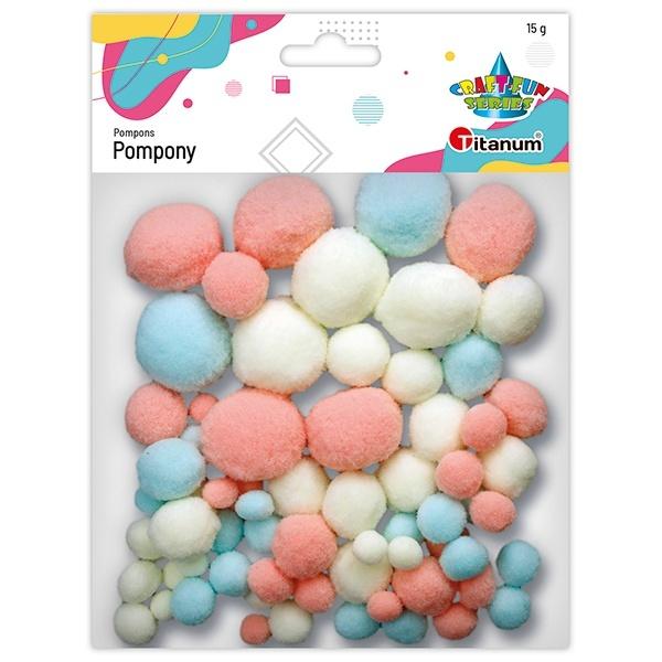 Pompony poliestrowe 10/15/20/25/30mm 15g mix kolorów pastelowych: biały, różowy pudrowy, miętowy