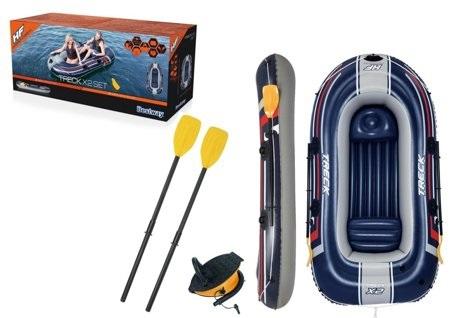 Dmuchany Ponton Niebieski 255 x 127 cm Bestway 61068 Treck X2 Wyjazd nad wodę to idealna forma spędzania wolnego czasu razem z najbliższymi. Aby urozmaicić sobie ten beztroski czas zaopatrz się w dodatkowe akcesoria basenowe. Ponton basenowy jest przeznaczony dla trzech osób i idealnie sprawdzi się podczas rekreacyjnej wycieczki po jeziorze lub basenie. Wykonany został z wytrzymałego winylu odpornego na uszkodzenia. Podłoga w pontonie jest nadmuchiwana, zwiększa to komfort siedzenia. Dołączone do zestawu wiosła idealnie dostosowane są do całodziennego wiosłowania. Mocne uchwyty i kółko do holowania pozwala na prosty i łatwy transport. Ponton wyposażony jest również w zawór, dzięki któremu po skończonej wyprawie w szybki sposób opróżnisz komory z powietrza. Zawartość zestawu: - dmuchany ponton - łatka naprawcza - dwa wiosła - pompka nożna Dane techniczne: - Wymiary materaca 255 cm x 127 cm - Maksymalne obciążenie 225 kg - waga 9 kg - ilość osób 2+1 - 3 komory powietrza - wytrzymały uchwyt - nadmuchiwane siedziska - pompowane dno - linka bezpieczeństwa umieszczona na całej długości - dulki na wiosła Wymiary opakowania: 72 cm x 37 cm x 16 cm