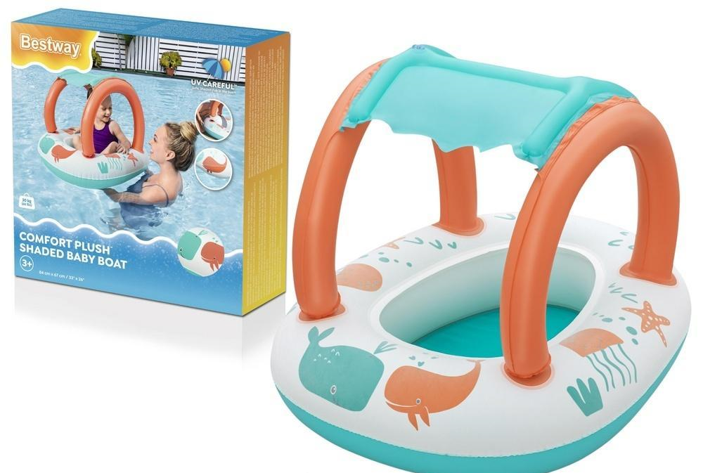 Dmuchany Ponton z Daszkiem 84 x 67cm Bestway 34203 Ten uroczy ponton to idealna zabawka wodna zaprojektowana z myślą o najmłodszych dzieciach, które dopiero rozpoczynają swoją przygodę z wodą. Unikalny kształt łódki w połączeniu z kolorową grafiką przyciąga uwagę i zachęca maluchy do zabawy, rozbudzając w nich ducha małego odkrywcy. Ponton wyposażony jest w praktyczny, odpinany daszek UV Careful, który chroni przed słońcem i zapewnia komfort podczas upalnych dni. Dzięki mocowaniu na rzepy, daszek można z łatwością zdjąć lub założyć w zależności od potrzeby. Przeznaczony dla dzieci od 3. roku życia, ponton zapewnia bezpieczną i radosną zabawę w wodzie - zarówno w basenie, jak i nad jeziorem czy morzem. To doskonały sposób na wprowadzenie dziecka w wodny świat w sposób przyjemny i komfortowy. Dane techniczne: - wymiary 84 cm x 67 cm - materiał PVC - maksymalne obciążenie 30 kg - dach mocowany na rzepy Wymiary opakowania: 20 cm x 20 cm x 5 cm Waga opakowania: 0,5kg