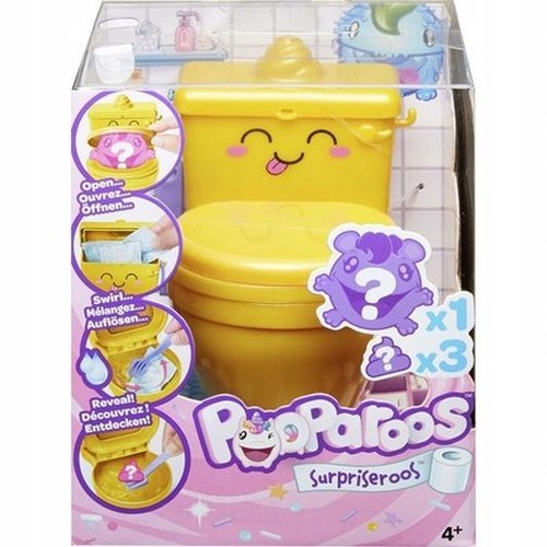 Otwórz toaletę i sprawdź, które z mięciutkich stworzonek Pooparoos Surpriseroos ukrywa się w środku Zajrzyj do zbiornika i wyciągnij magiczne pakunki Wlej wodę do sedesu, wrzuć jeden z pakunków i pomieszaj łyżeczką, zobaczysz jedzonka dla swojego pupila Wiek: 4+