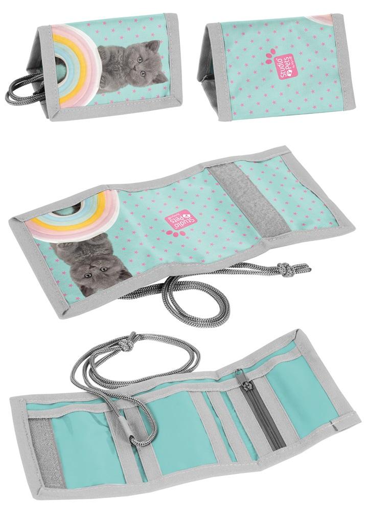 Portfel ze sznurkiem do zawieszania. Jedna przegródka na zamek na monety, jedna przeźroczysta kieszonka np. na zdjęcie, dwie dodatkowe kieszonki, jedna kieszeń przez całą długość rozłożonego na płasko portfela.