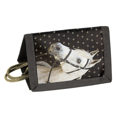 Portfel ze sznurkiem do zawieszania. Jedna przegródka na zamek na monety, jedna przeźroczysta kieszonka np. na zdjęcie, dwie dodatkowe kieszonki, jedna kieszeń przez całą długość rozłożonego na płasko portfela.