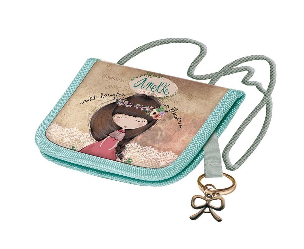 Piękny dziewczęcy portfel z wizerunkiem Anekke. Portfel posiada kieszonkę zamykaną na suwak oraz miejsce na legitymację lub dokumenty. Dzięki dołączonemu sznurkowi można go nosić na szyi. Wymiary 12,5x9,5x1 cm