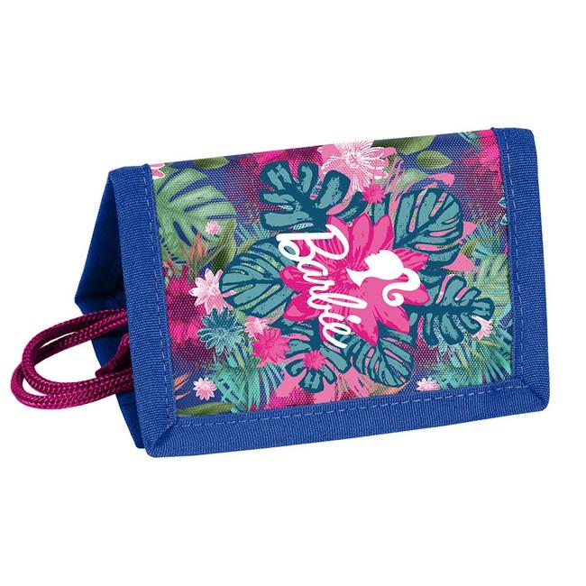 Portfel Barbie w kwiaty ze sznurkiem do zawieszania. Portfel ma jedną przegródkę na zamek na monety oraz jedną przeźroczystą kieszonkę na małe zdjęcie. Jedna kieszeń przez całą długość rozłożonego na płasko portfela mieści papierowe banknoty a dwie dodatkowe kieszonki mogą przydać się do przechowywania różnych informacji.