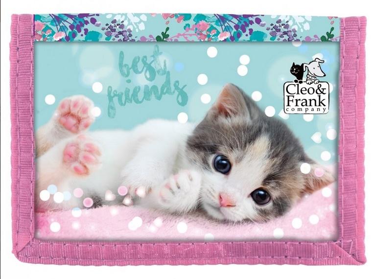Różowy portfel z aplikacją przedstawiającą urocze kotki.