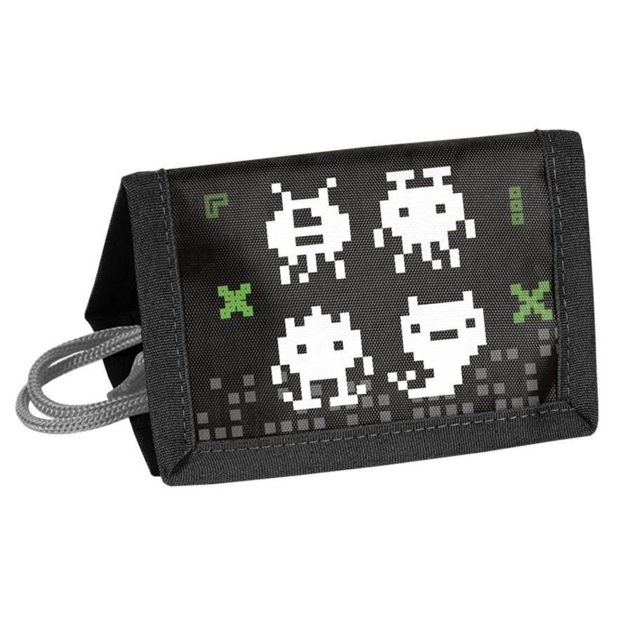 Portfel Gaming ze sznurkiem. Portfel posiada wiele funkcjonalnych przegród zapewniających dobrą organzację. Wewnątrz kieszonka na zamek na monety oraz przeźroczysta kieszonka na małe zdjęcie. Obszerna kieszeń przez całą długość rozłożonego na płasko portfela mieści papierowe banknoty, a dwie dodatkowe przegrody mogą przydać się do przechowywania różnych informacji. Model wyposażony został w sznureczek umożliwiający zawieszenie lub przymocowanie produktu.