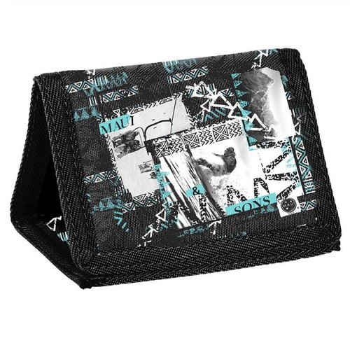 Praktyczny portfel młodzieżowy Maui and Sons zielono-czarny. Portfel ma jedną zamykaną na zamek przegródkę na monety, przegrodę na banknoty oraz liczne przegrody na dokumenty. Wzór portfela może stanowić idealny dodatek do plecaka w tym samym designie.