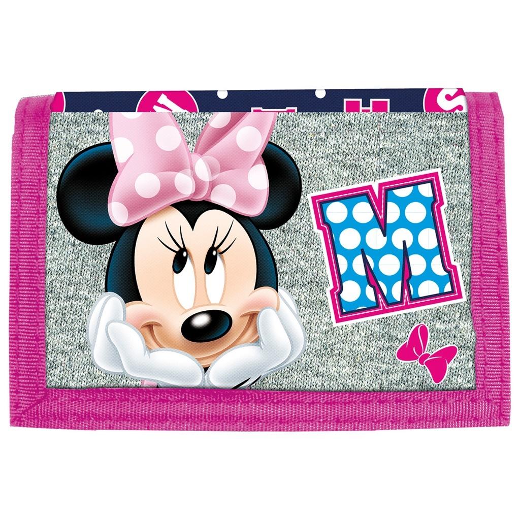 Portfelik dziecięcy rozkładany, zamykany na rzep. Miejsce na dokumenty, zamykana kieszonka na bilon. Ozdobiony motywem Minnie.