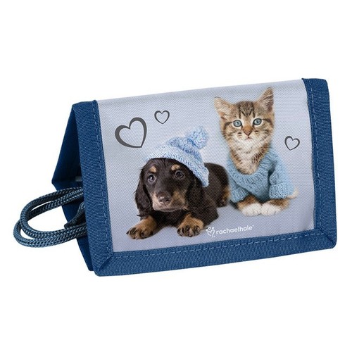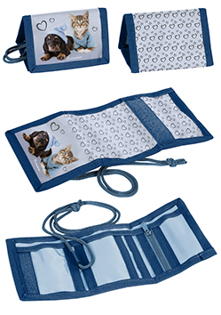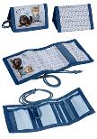 Portfel ze sznurkiem do zawieszenia. Jedna przegródka na zamek na monety, jedna przezroczysta kieszonka np. na zdjęcie, dwie dodatkowe kieszonki, jedna kieszeń na całej długości portfela.