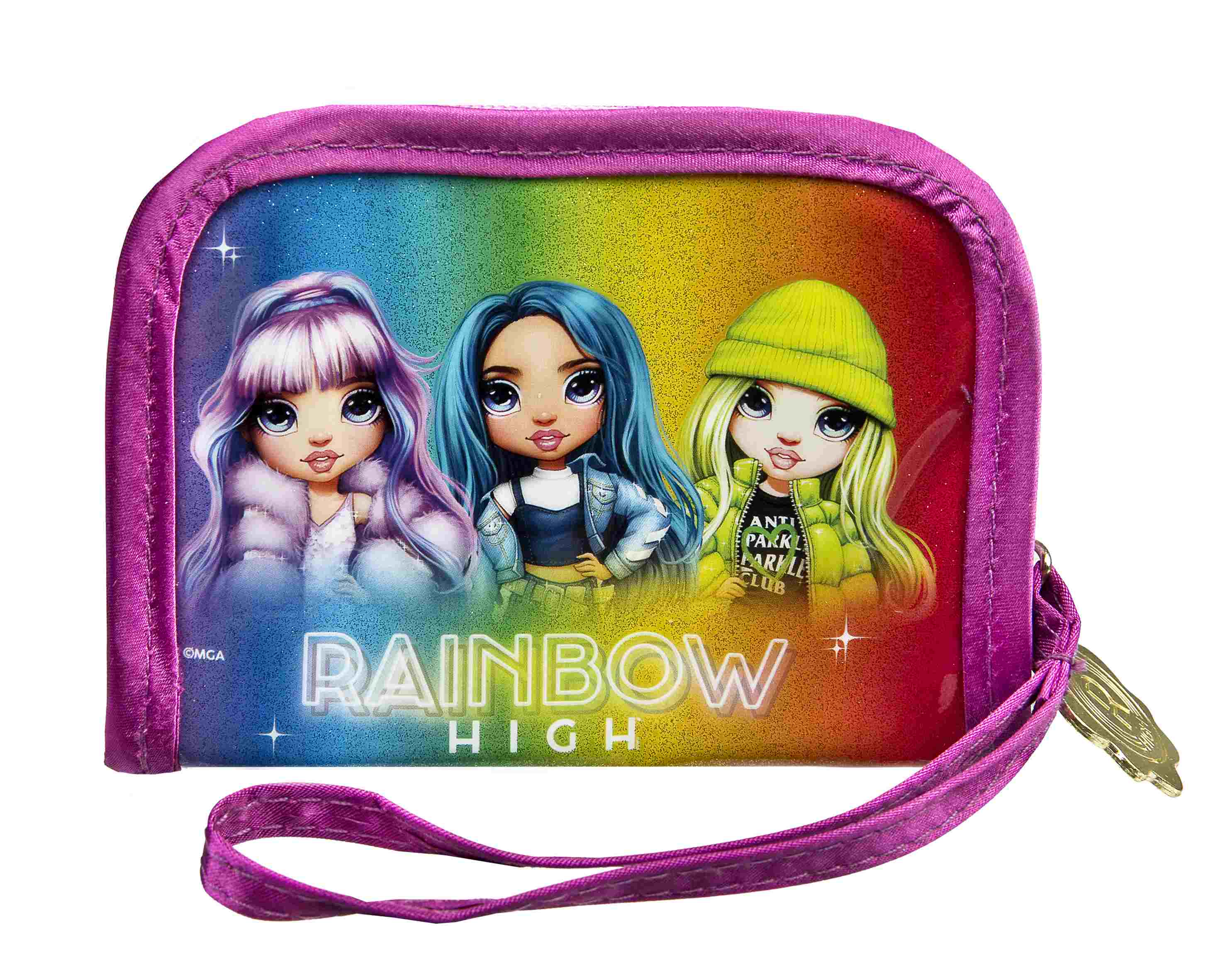 Satynowy portfel dziecięcy Rainbow High zamykany na zamek. Dodatkowo posiada nieodpinany sznurek, dzięki któremu dziecko może nosić portfel zawieszony na ręce