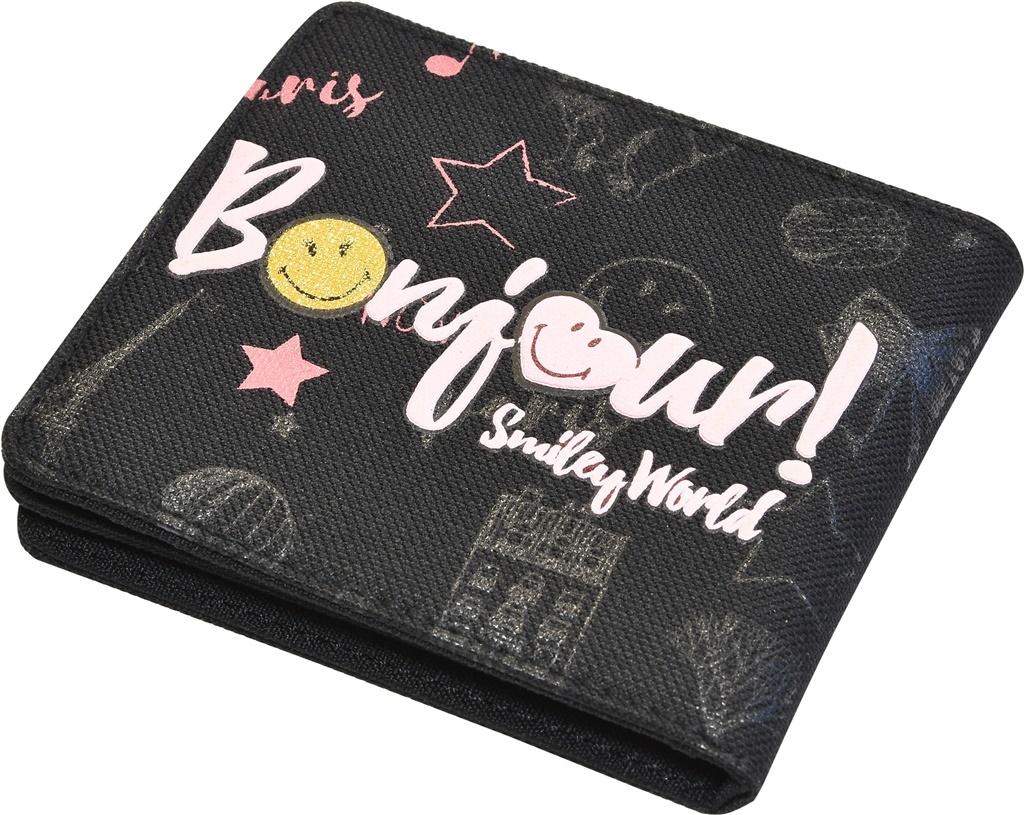 Uroczy portfel na licencji Smiley World, w czarno-różowych kolorach. Portfel z miejscem na banknoty, karty, kieszonką zapinaną na zamek na monety. Wewnątrz dodatkowa klapka na karty lub dokumenty.