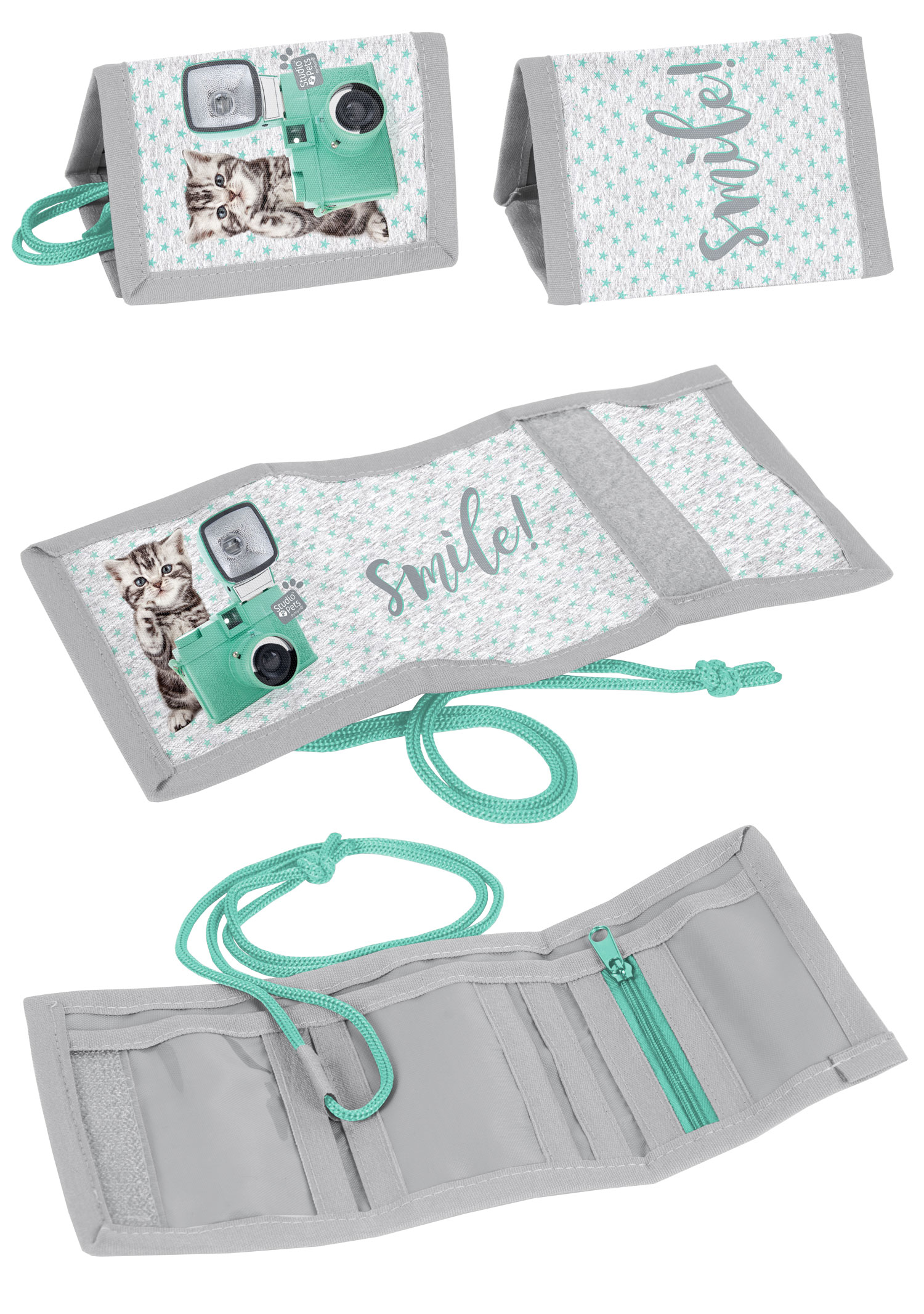 Portfel ze sznurkiem do zawieszania. Jedna przegródka na zamek na monety, jedna przeźroczysta kieszonka np. na zdjęcie, dwie dodatkowe kieszonki, jedna kieszeń przez całą długość rozłożonego na płasko portfela.