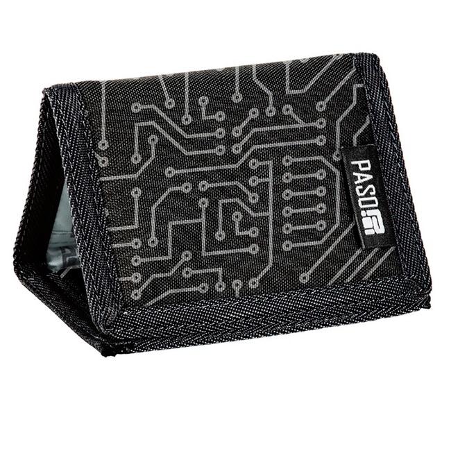 Praktyczny portfel młodzieżowy szaro-czarny. Portfel ma jedną zamykaną na zamek przegródkę na monety, przegrodę na banknoty oraz liczne przegrody na dokumenty. Wzór portfela może stanowić idealny dodatek do plecaka w tym samym designie.
