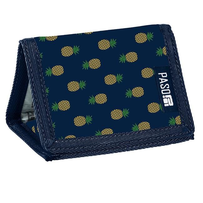 Praktyczny portfel młodzieżowy granatowy w ananasy. Portfel ma jedną zamykaną na zamek przegródkę na monety, przegrodę na banknoty oraz liczne przegrody na dokumenty. Wzór portfela może stanowić idealny dodatek do plecaka w tym samym designie.