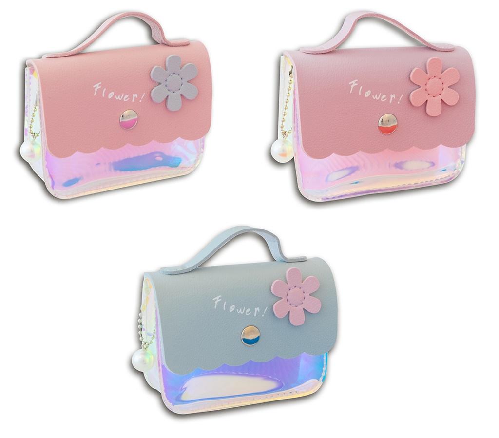 Portfeliki Glossy flower wykonane są z błyszczącego, przeźroczystego materiału i sztucznej skóry. Portfeliki ozdobione są kwiatkiem i wiszącą perełką. Portfelik zamykany jest na magnes. Dostępne w trzech kolorach: pastelowy fiolet, pastelowy niebieski i pastelowy różowy.