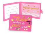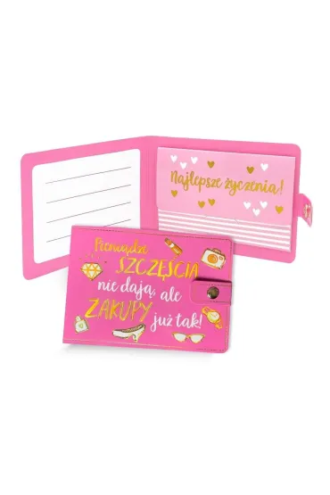 Portfelik POR-015 "Pieniądze szczęścia nie dają, ale zakupy już tak" Portfeliki z życzeniami to alternatywa dla tradycyjnych kartek, są wyjątkowym sposobem na podarowanie bliskiej osobie banknotu. Portfeliki są kolorowe i uszlachetnione metalizowaną folią hot-stamp, oraz są wyposażone w zamknięcie na zatrzask, co umożliwia ich wielokrotne otwieranie i zamykanie - jak w prawdziwym portfelu. Portfeliki zawierają niebanalne teksty oraz życzenia w środku. Specyfikacja: wymiary: 11 x 8 cm (po złożeniu) wnętrze: życzenia w środku waga: 13 g okazja: ogólne życzenia