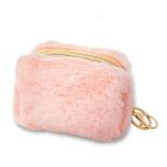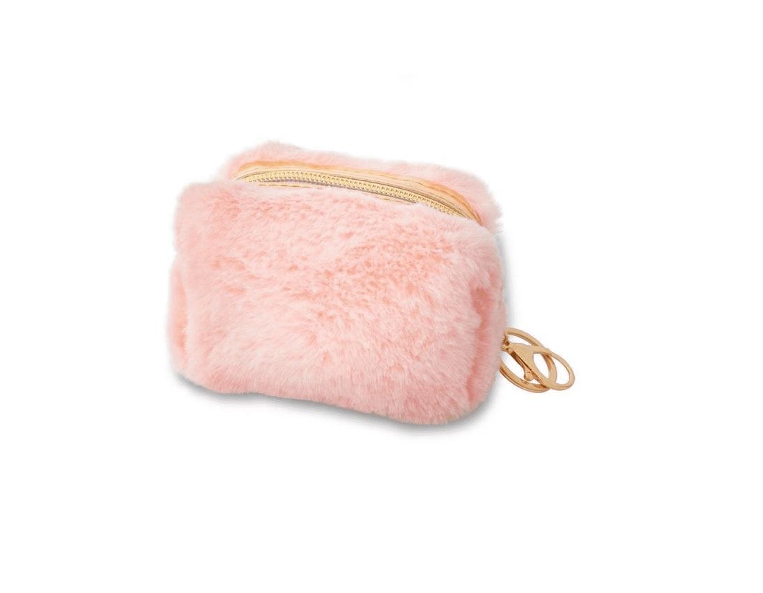 Różowy portfelik o króciótkim futerku, wykończony złotym materiałem. Zamykany na suwak błyskawiczny, od wewnątrz wykończony podszewką. Portfelik łatwo przyczepić dzięki dwóm rodzajom breloka.