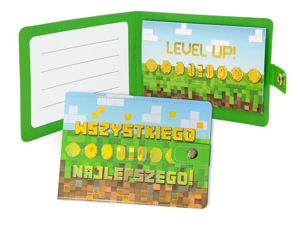 Portfelik POR-005 "Wszystkiego najlepszego" (minecraft) Portfeliki z życzeniami to alternatywa dla tradycyjnych kartek, są wyjątkowym sposobem na podarowanie bliskiej osobie banknotu. Portfeliki są kolorowe i uszlachetnione metalizowaną folią hot-stamp, oraz są wyposażone w zamknięcie na zatrzask, co umożliwia ich wielokrotne otwieranie i zamykanie - jak w prawdziwym portfelu. Portfeliki zawierają niebanalne teksty oraz życzenia w środku. Specyfikacja: wymiary: 11 x 8 cm (po złożeniu) wnętrze: życzenia w środku waga: 13 g okazja: ogólne życzenia, urodziny
