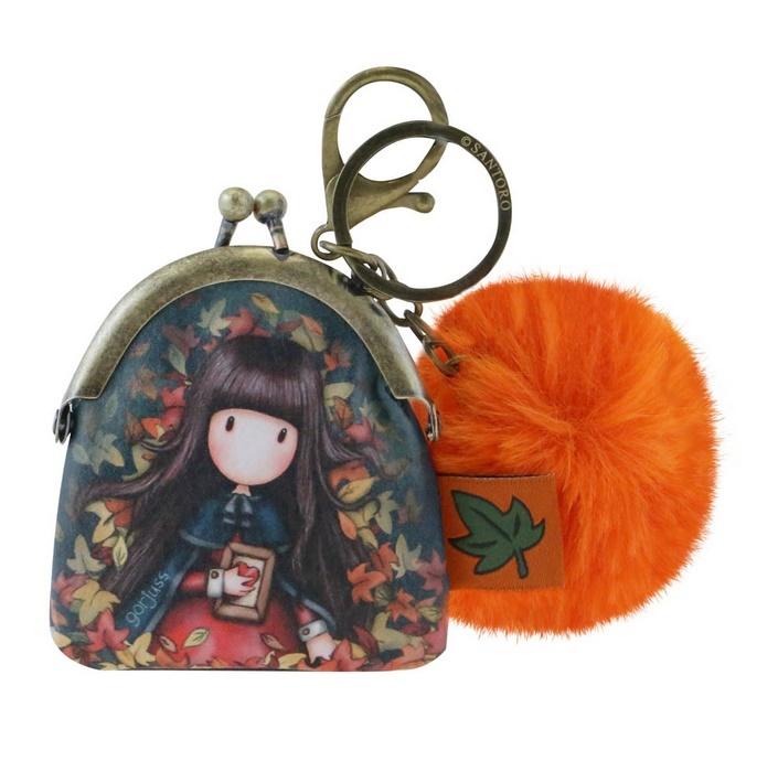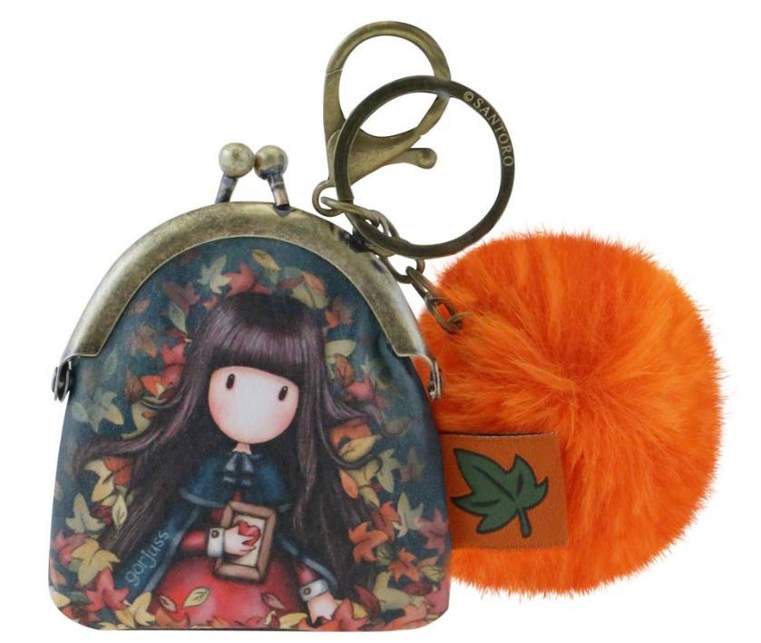 Portmonetka, Breloczek - Gorjuss - Autumn Leaves. Piękna portmonetka, w której zmieścisz wszystkie monety. Ozdobiona wizerunkiem dziewczynki Gorjuss na tle jesiennych liści. Żywe kolory i wzorzysta podszewka oraz oryginalny wzór. Ozdobiona puszystym pomponem. Dodatkowo kółko na breloczek i karabińczyk na klucze.