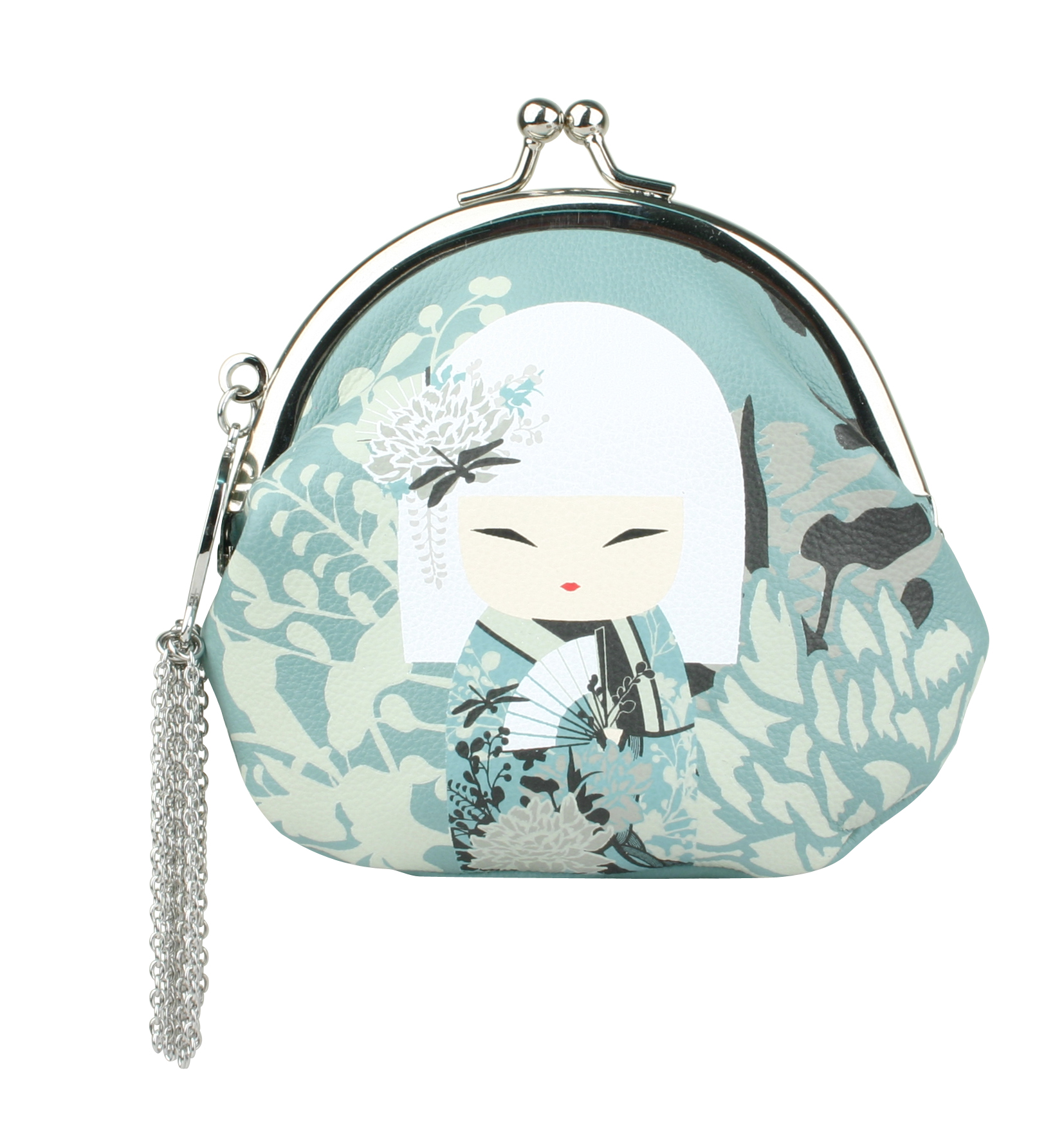 Portmonetka z kolekcji kimmidoll z wizerunkiem kokeshi Miyuna - wdzięczna.Materiał skóra ekologiczna, zapinana na zatrzask zakończona frędzlem z łańcuszków.Wymiary:100x105x20 mm.