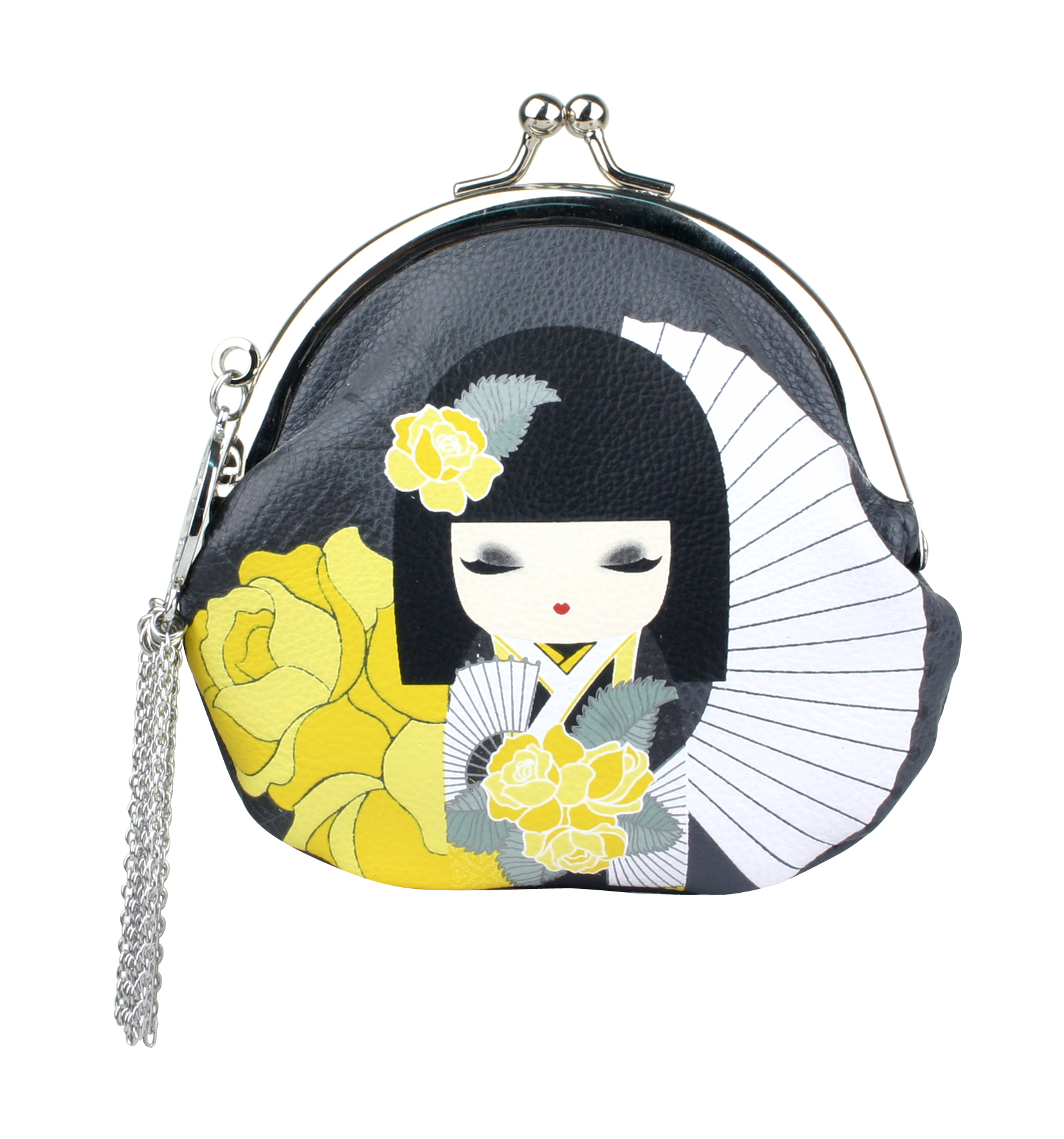 Portmonetka z kolekcji kimmidoll z wizerunkiem kokeshi Naomi - prawdziwe piękno.Materiał skóra ekologiczna, zapinana na zatrzask zakończona frędzlem z łańcuszków.Wymiary:100x105x20 mm.
