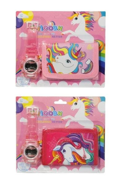 Zestaw portfel + zegarek. Portfel zdobi wizerunek jednorożca. Zegarek działa na baterie AG3. Bateria znajduje się w zabawce. Produkt zapakowany w kartonową podstawkę z przezroczystym kloszem Produkt występuje w kilku wersjach kolorystycznych, wybierany losowo. Cena dotyczy jednej sztuki. Zabawka dla dzieci od 3 lat.