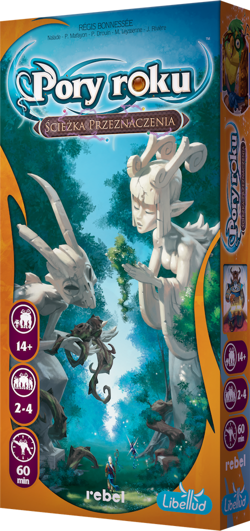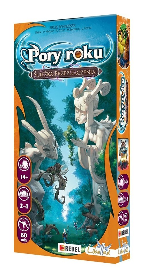 „Ścieżka Przeznaczenia” to drugie rozszerzenie do gry „Pory roku”. Zawiera 21 nowych kart Mocy (po dwie kopie każdej karty), które można łączyć ze wszystkimi innymi kartami. Rozszerzenie zawiera także 6 dodatkowych żetonów zdolności specjalnych, które wyróżnią Twojego czarnoksiężnika spośród innych, a także 10 nowych kart Czarów. Wśród tych ostatnich są i takie, które pozwolą Ci uwolnić tajemne moce kości Przeznaczenia! Przygotuj się więc na nowe wyzwania i czary! Pory Roku (Seasons) Uwaga! To nie jest samodzielna gra! Do rozgrywki wymagana jest podstawowa wersja gry: Pory Roku (Seasons). Zawartość pudełka: 42 karty Mocy 1 kość Przeznaczenia 6 żetonów zdolności specjalnych 20 znaczników punktów Przeznaczenia 10 kart Repliki 10 kart Czarów 2 znaczniki Uwięzienia 2 znaczniki Zamknięcia Gra przeznaczona jest dla 2-4 osób w wieku powyżej 14 lat
